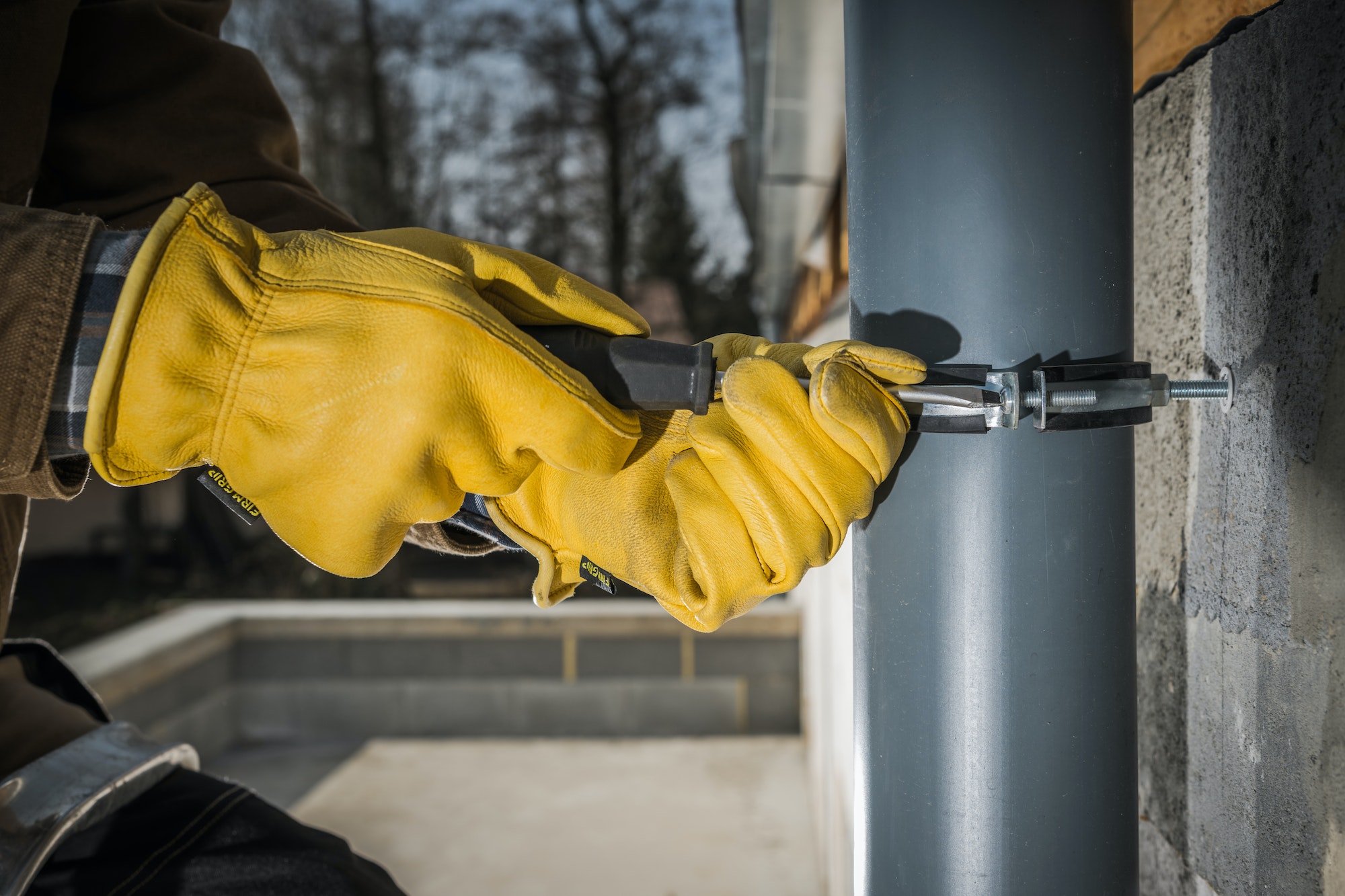 Construction Worker Attaching Home Gutters to the Building Wall